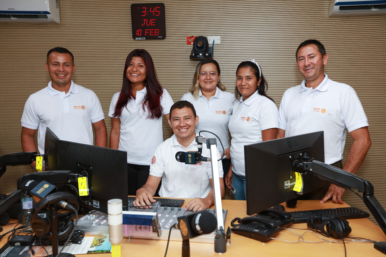 Los periodistas Gina Villalba, Diana Matabajo, Francy González, Pedro Arias, Álvaro Martínez y el técnico Mauro Moreno, conforman el equipo de trabajo de Radio Nacional de Colombia en la emisora de paz de Mesetas (Meta), un municipio que luego de años de sufrir el rigor de la violencia, hoy se erige como destino turístico.