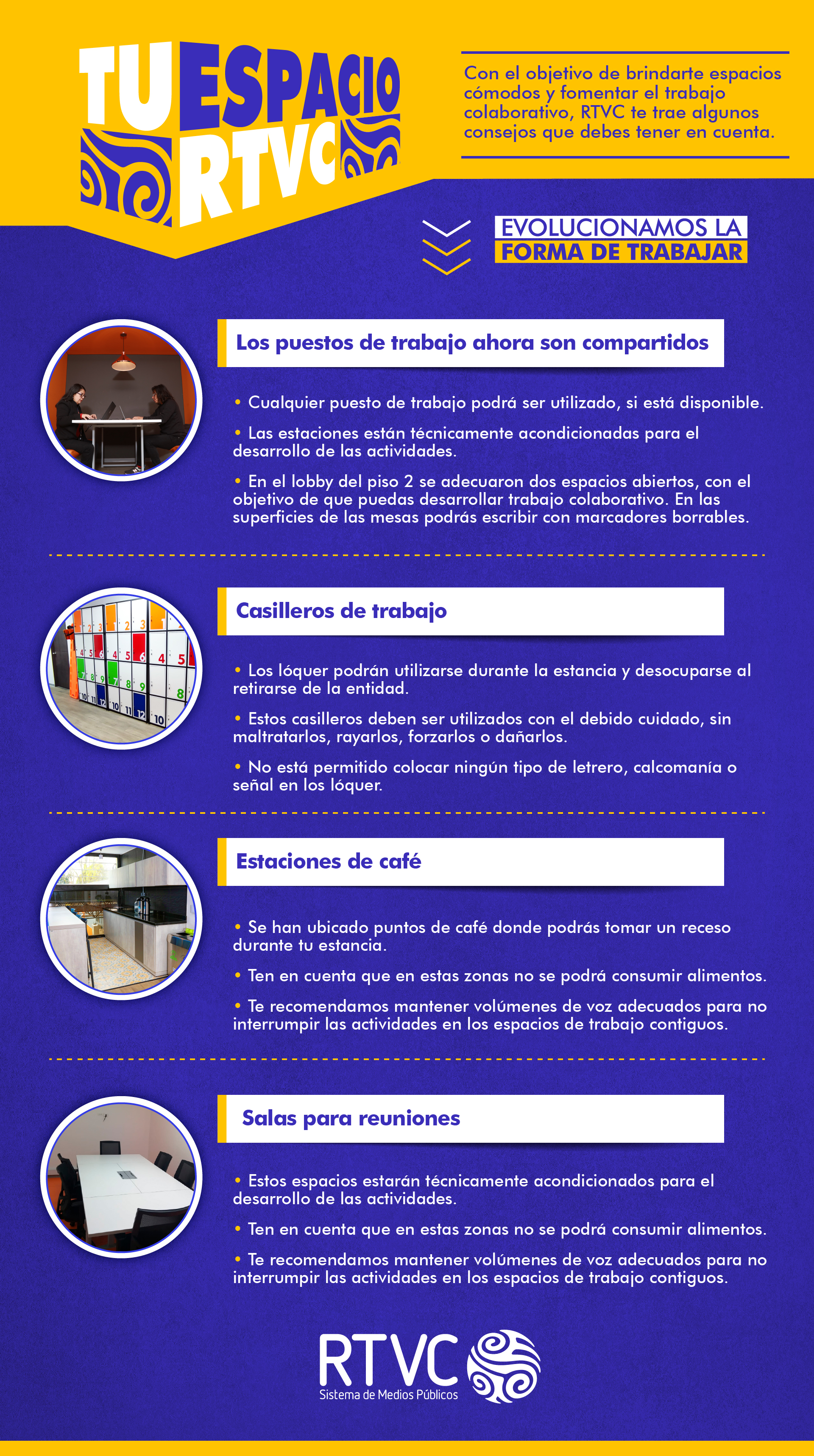 Tu espacio RTVC es una iniciativa creada para que los colaboradores disfruten de áreas de trabajo innovadoras, en las que puedan compartir sus ideas, proyectos e iniciativas, en un ambiente que les proporcione bienestar y fomente la productividad. Hoy te traemos algunas recomendaciones para que puedas disfrutar de manera adecuada cada uno de estos lugares.