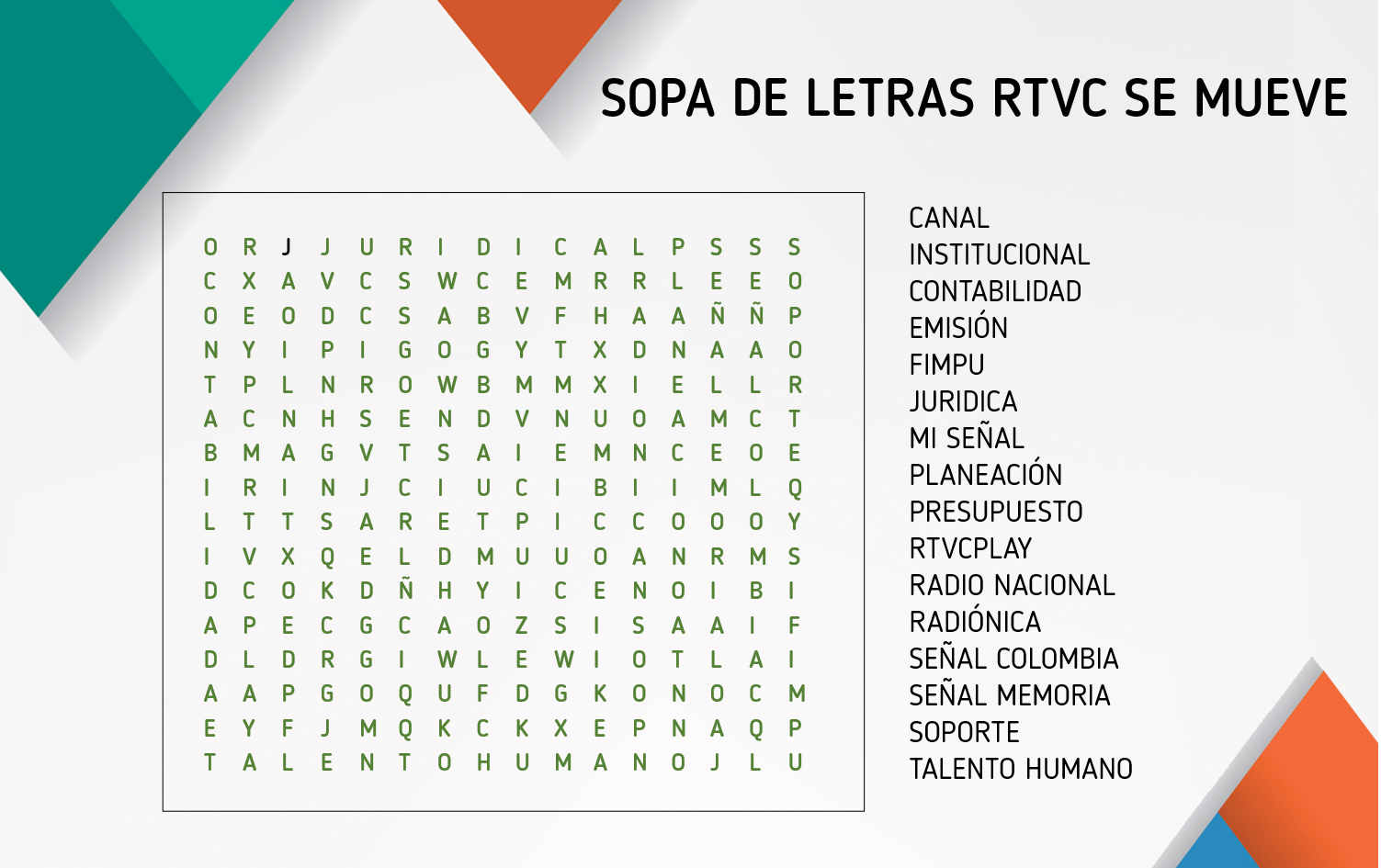 - Los tres primeros colaboradores que diligencien la sopa de letras de forma correcta y lo traigan impreso en PAPEL RECICLADO a la Coordinación de Comunicaciones ganarán.
