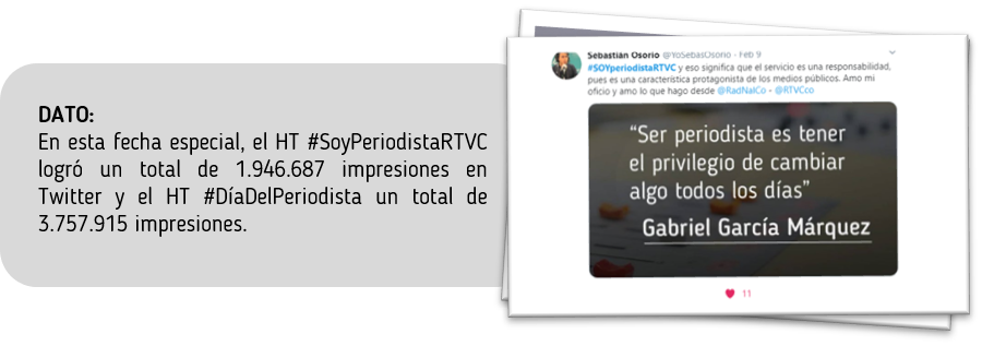#SoyPeriodistaRTVC | Se conmemoró en RTVC el ‘Día del periodista’ para exaltar el trabajo de todos aquellos que diariamente engrandecen el nombre del Sistema de Medios públicos y de cada una de sus marcas. ¿Qué significa ser periodista en RTVC? fue la pregunta que muchos profesionales que desarrollan este oficio en esta casa respondieron, y es grato saber que todos tuvieron un punto en común: ser periodista en RTVC significa estar comprometido con la transformación del país, con transparencia y responsabilidad. En redes sociales muchos apoyaron el trabajo periodístico que se realiza en esta entidad, se sumaron a la conversación y compartieron sus felicitaciones y buenos deseos porque aquí, en el Sistema de Medios Públicos de los colombianos, se continúe trabajando todos los días por y para Colombia. ¡GRACIAS y felicitaciones a todos los periodistas que a través de su trabajo en digital conectan a esta entidad con cada rincón del país!