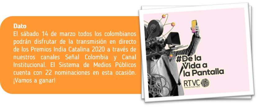 Pero no sólo es protagonista en este escenario, también lo es gracias a sus 22 nominaciones a los premios India Catalina con sus 14 productos de Señal Colombia, 1 de Canal Institucional y 7 de RTVCPlay, los cuales serán entregados el sábado 14 de marzo, basados en la selección que haga el comité de expertos y en la votación del público.