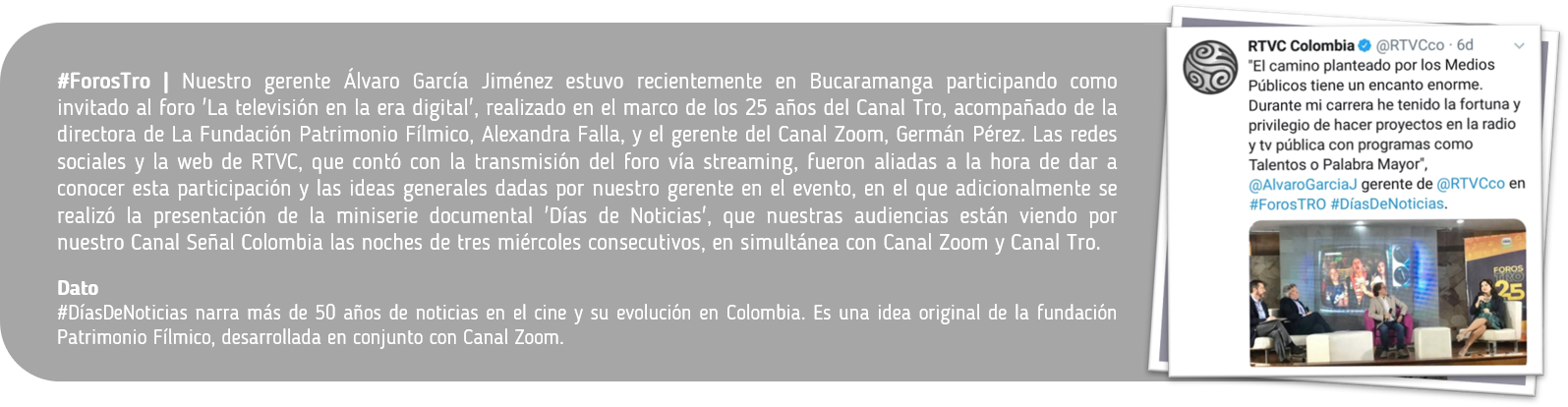 #SabíasQue el gerente de RTVC, Álvaro García, participó el pasado miércoles en el foro “El contenido colombiano en las plataformas de video bajo demanda” que se realizó en la Universidad Externado de Colombia. En su participación, el gerente expuso la misión de los canales públicos como RTVC para llevar a sus audiencias una oferta de contenidos novedosos que reflejen y transmitan la identidad nacional del país.