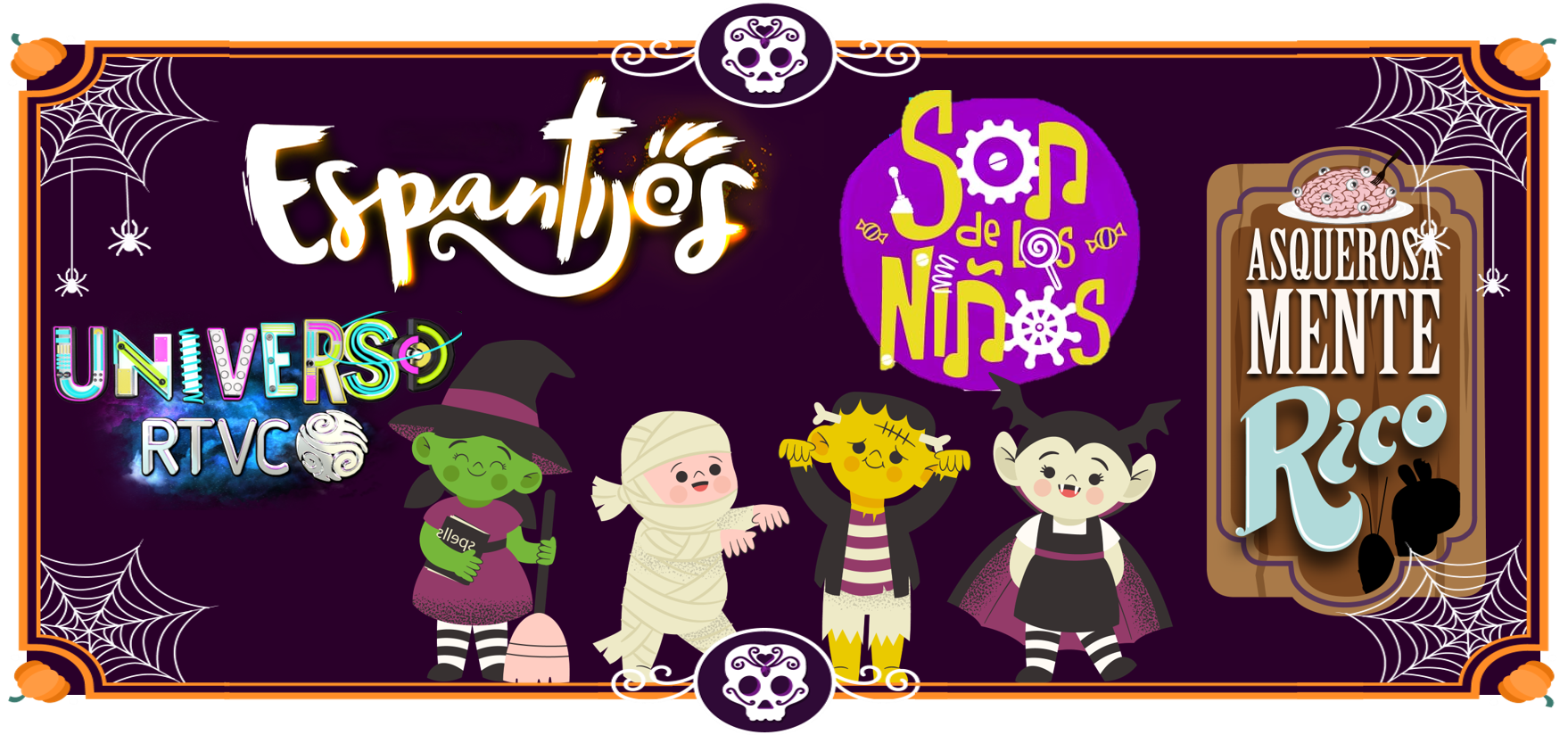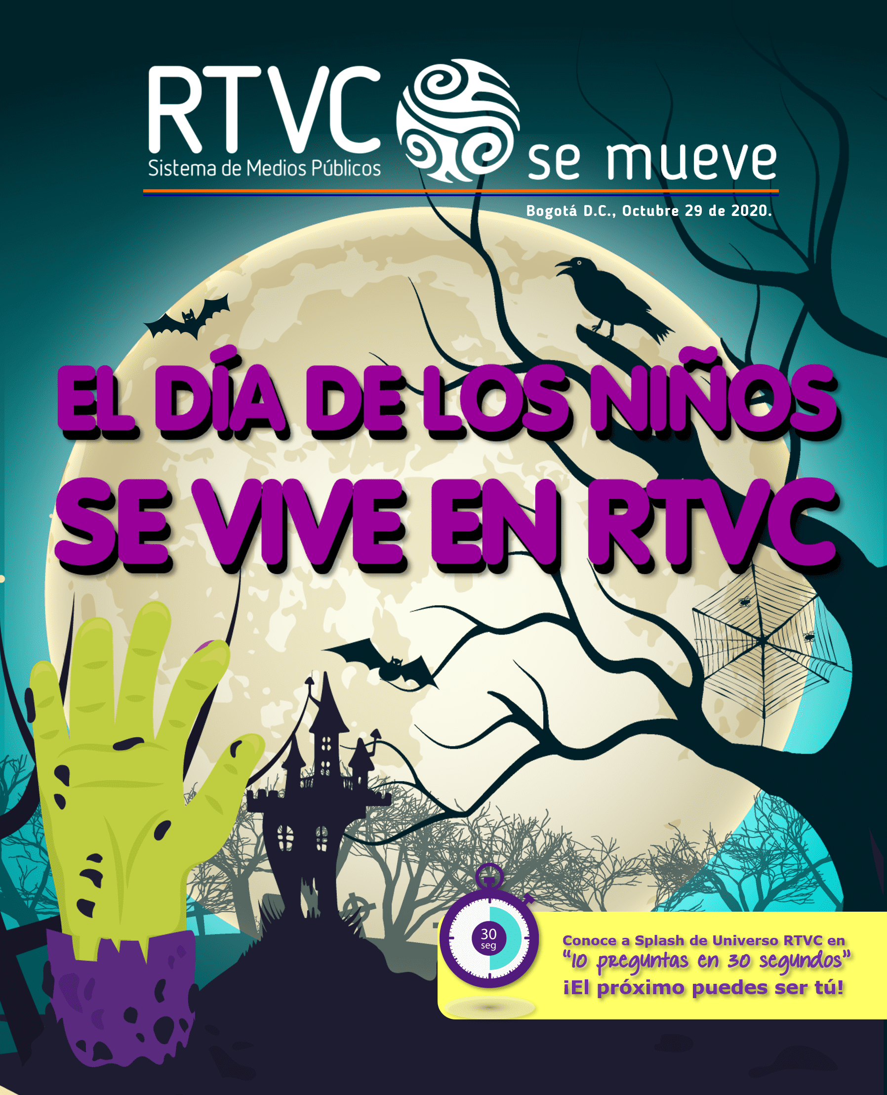 Por su parte, Splash, La Tiya, Sol, Romualdo, Hilurio, Soyel y Procopio, los personajes de Universo RTVC, celebrarán el ‘día de los muertos’ con aventuras dentro de las instalaciones de los Medios Públicos el domingo 1 de noviembre a la 1:30 p. m. por Señal Colombia y a las 3:30 p. m en Canal Institucional.