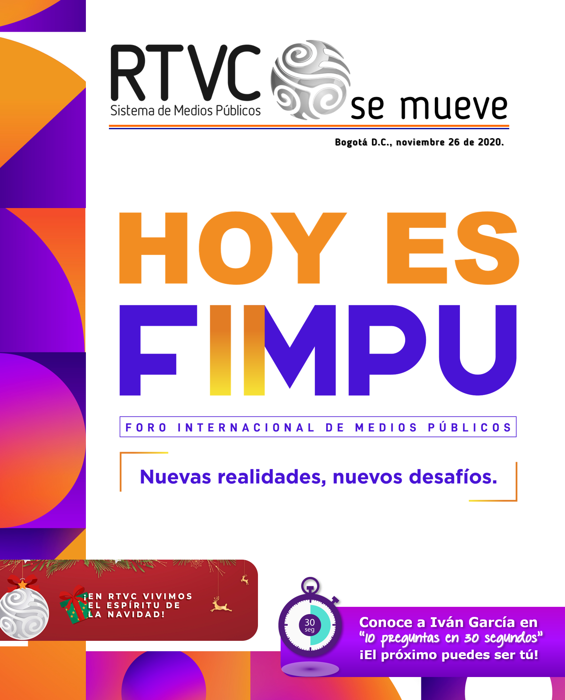 La espera terminó y hoy todos los colaboradores de RTVC nos unimos para participar en la segunda edición del Foro Internacional de Medios Públicos (FIMPU), que este año es virtual y ¡tú eres parte de esta fiesta académica!