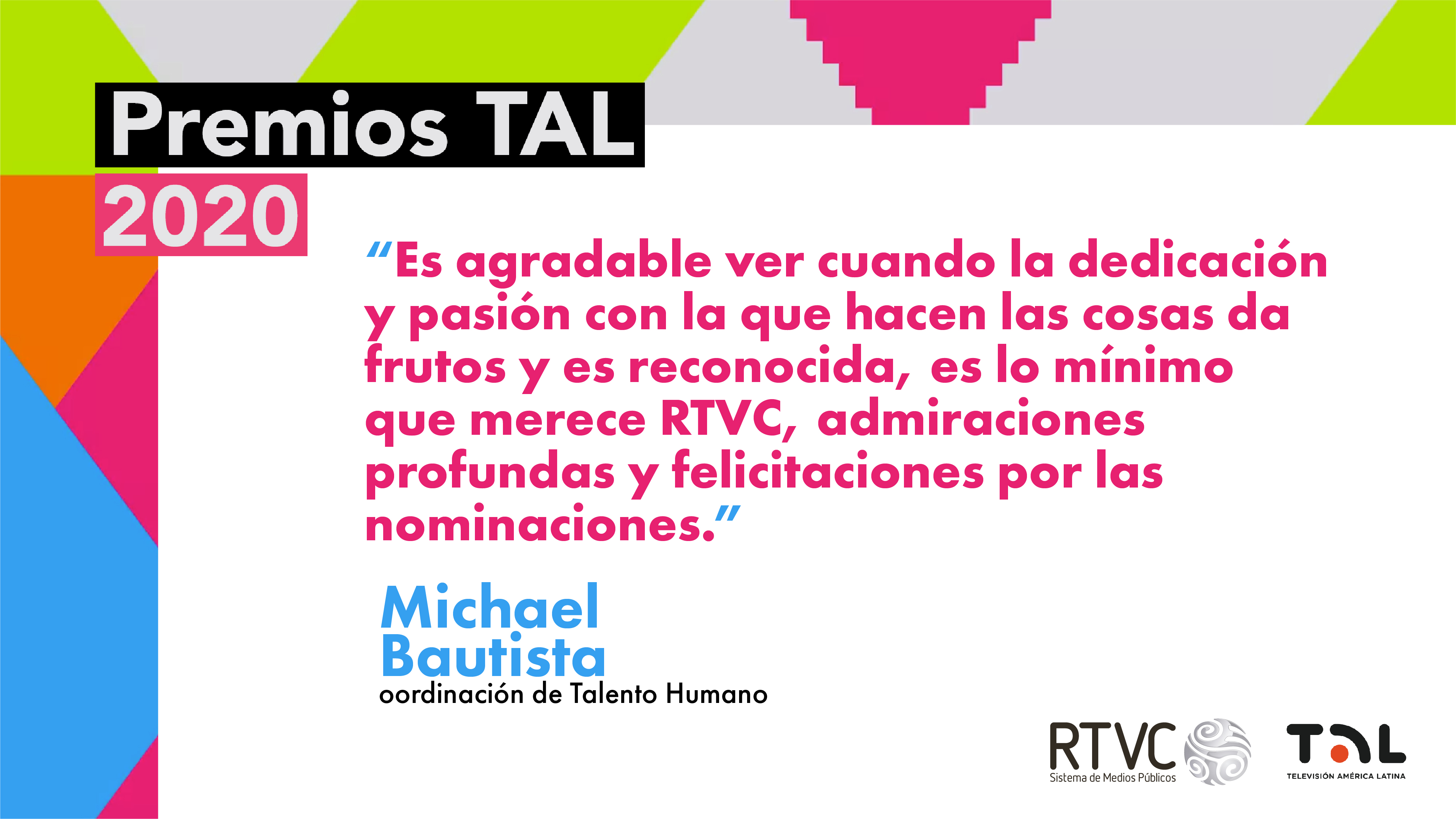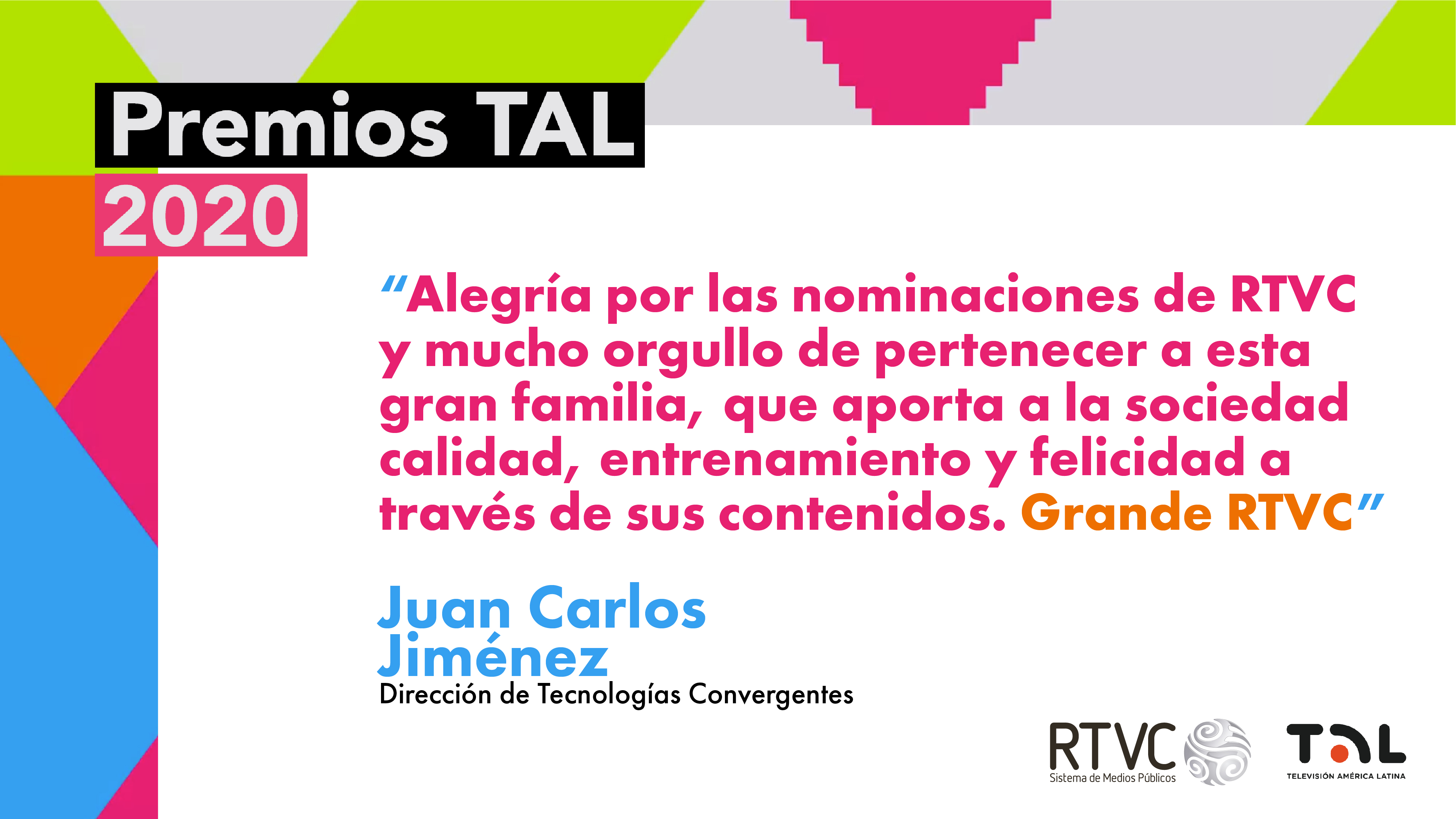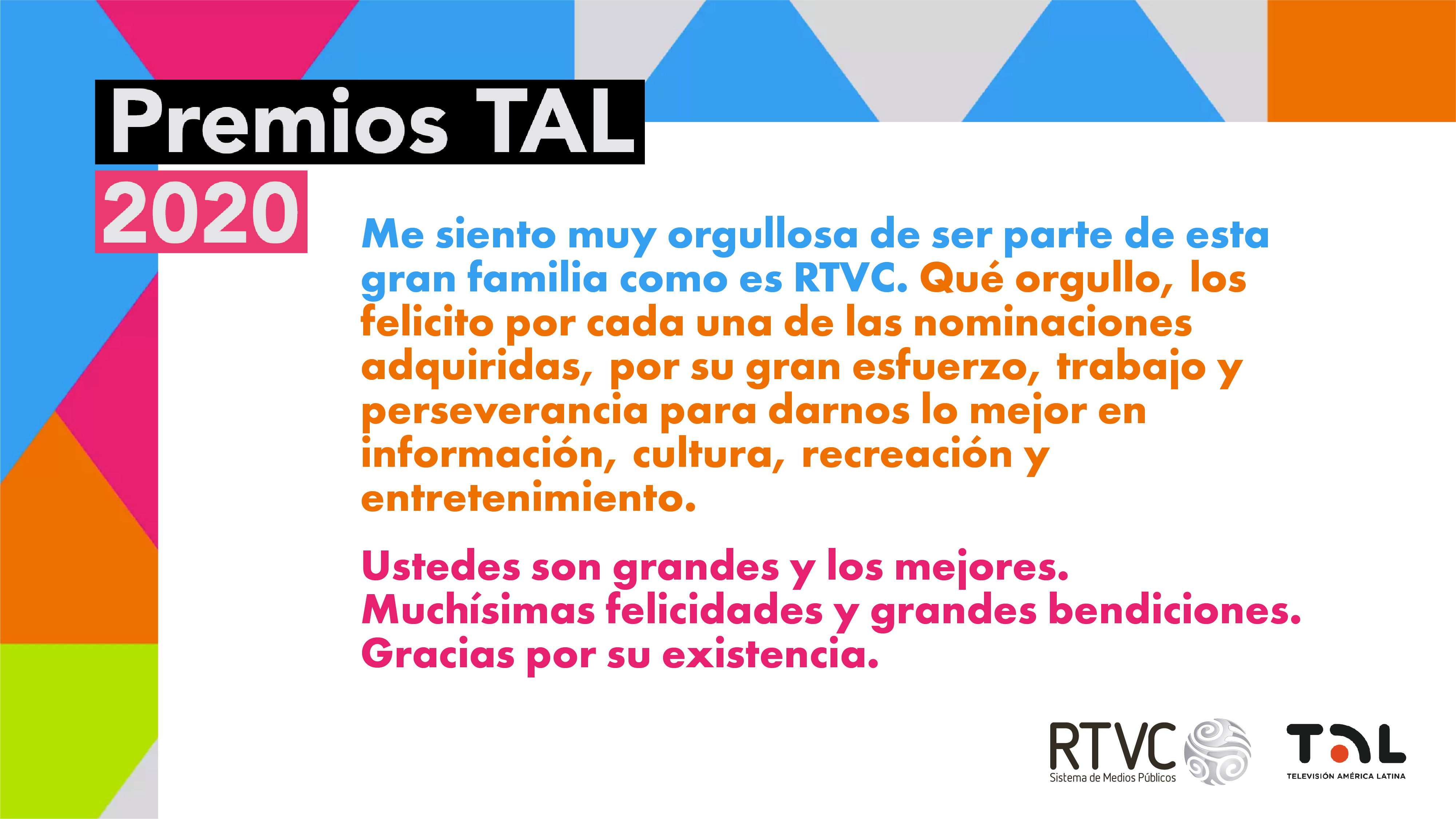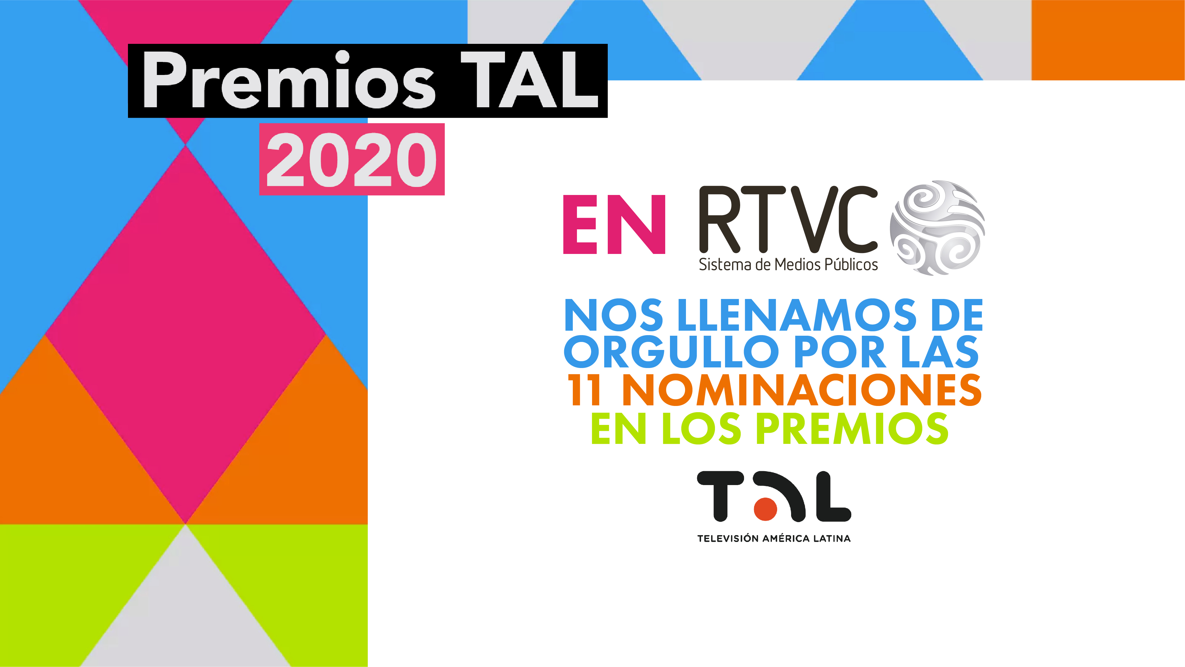 En RTVC nos sentimos orgullosos por las 11 nominaciones que hemos recibido para los Premios TAL 2020. Llegar a este nivel de reconocimiento en los galardones que exaltan a los mejores trabajos de la televisión pública de Latinoamérica es fruto del trabajo, dedicación y profesionalismo de toda la familia del Sistema de Medios Públicos.