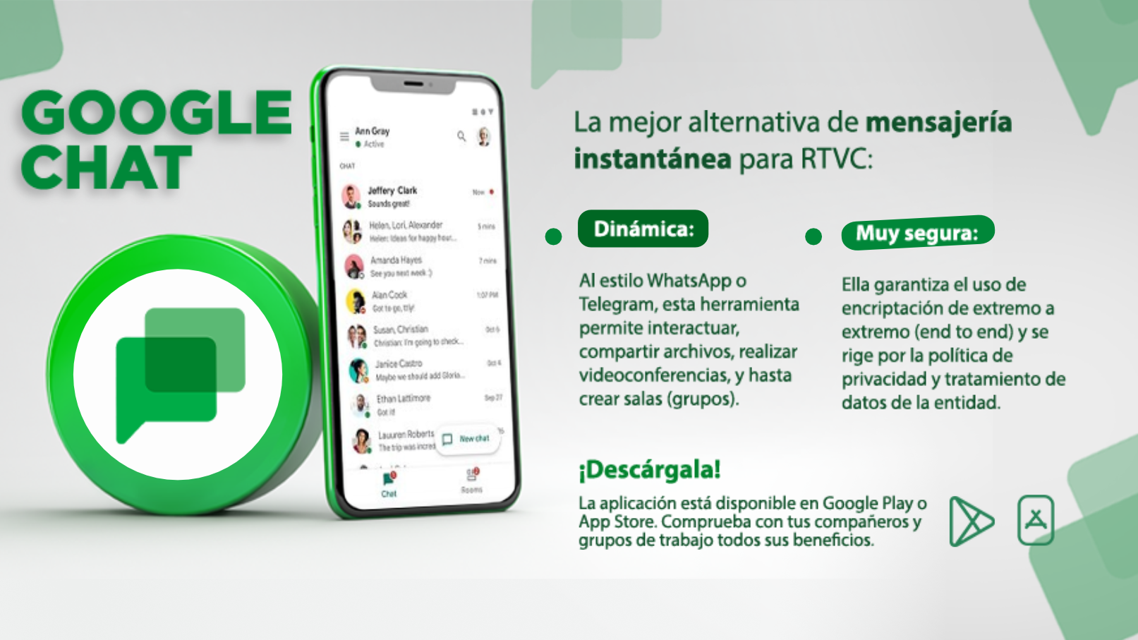 Como parte del fortalecimiento de la infraestructura tecnológica para atender las necesidades de los colaboradores de la Entidad, y siguiendo los lineamientos de la Directiva Presidencial No. 03 del 15 de marzo de 2021, en la que se establece la activación de la innovación a partir de entornos confiables en las entidades públicas, la Coordinación de Tecnologías de la Información (T.I.) les invita a hacer uso de la herramienta de comunicación digital, Google chat, que hace parte de la Suite de Google con la que cuenta RTVC.