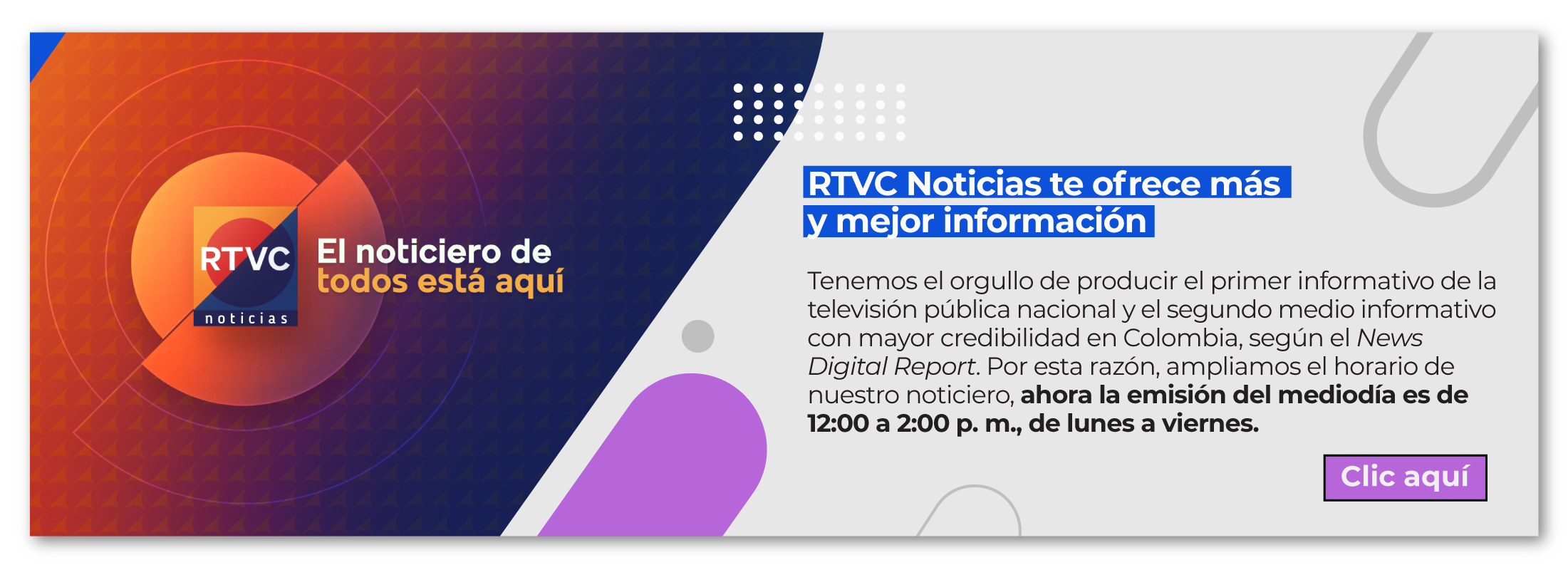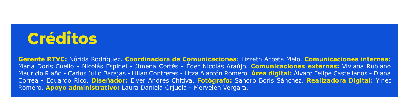 Existe algo especial en RTVC que nos genera orgullo y nos da la certeza de ser parte de la construcción de una entidad que día a día trabaja por la creación, gestión y difusión de contenidos incluyentes y diversos de alta calidad para los colombianos y que tienen el propósito de formar, informar, entretener y educar.