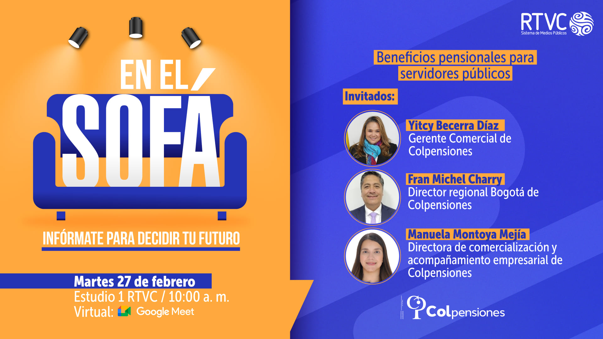 Este espacio, que se caracteriza por generar empatía y confianza entre quienes hacemos parte de RTVC, vuelve con más fuerza y con invitados especiales como los colaboradores de Colpensiones, quienes este martes 27 de febrero, a las 10:00 a. m., en el Estudio 1, nos hablarán sobre los beneficios de afiliarse a esta administradora de pensiones, vinculada al Ministerio del Trabajo.