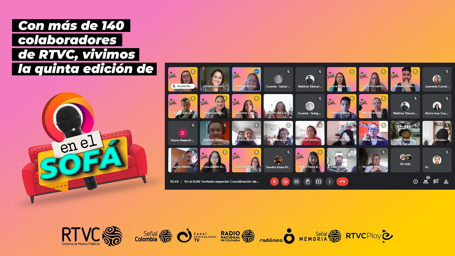 Felicitamos a Juan Carlos Jiménez Corredor de la Coordinación de Tecnologías de la Información (T.I.), Germán Augusto Camacho Cepeda de Señal Memoria y a María Elvira Medina Lagos de la Coordinación de Tesorería por ser los ganadores de este encuentro virtual. Finalmente, agradecemos a todos los colaboradores que nos acompañaron en esta quinta edición de En el Sofá.