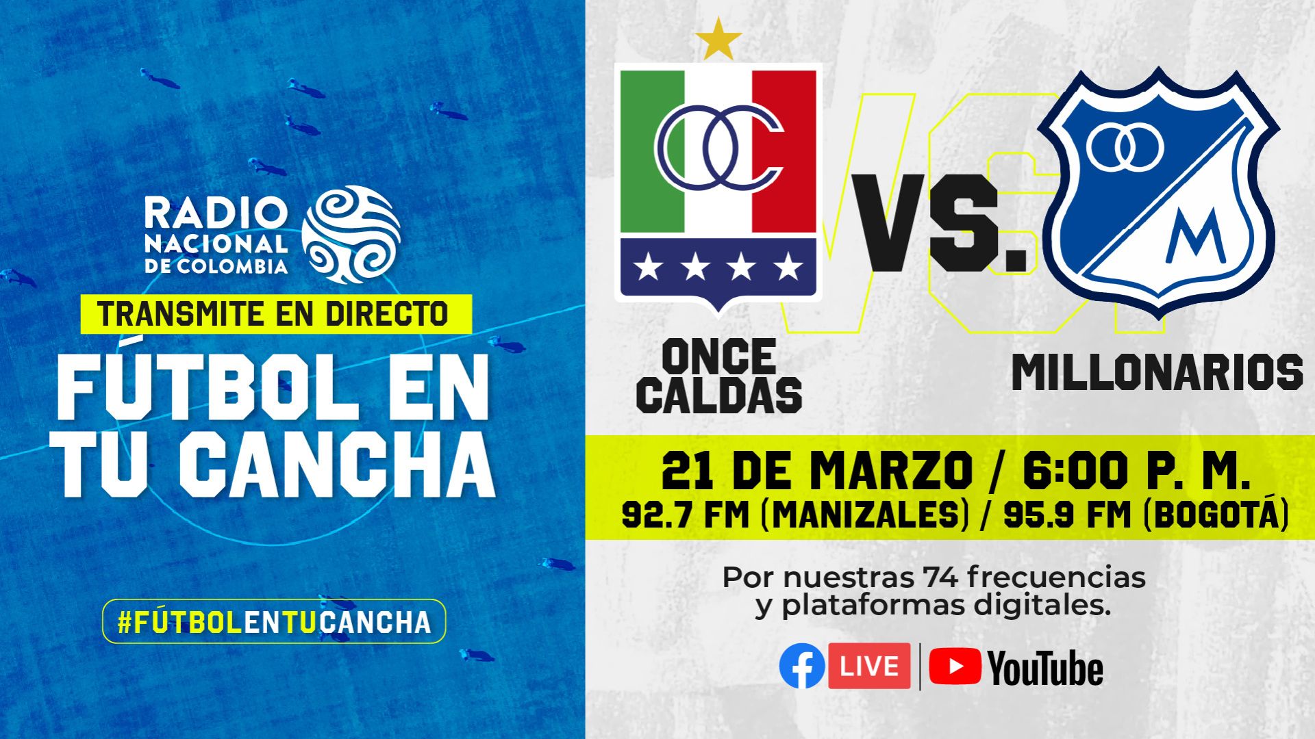 Este sábado 21 de marzo, desde las 6:00 de la tarde, los oyentes de las 74 frecuencias de Radio Nacional de Colombia disfrutarán del gran partido que se jugará en el Estadio Palogrande, de Manizales.