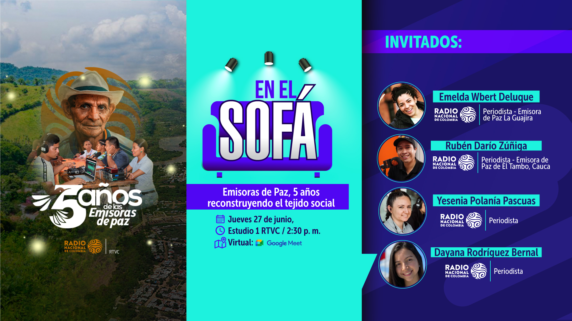 Este jueves 27 de junio, a las 2:30 p. m., en el Estudio 1 de RTVC, tendremos en el espacio preferido por los colaboradores del Sistema de Medios Públicos llamado ‘En el Sofá’, a los periodistas de la Radio Nacional de Colombia, Yesenia Polanía, Dayana Rodríguez, Emelda Wbert Deluque y Rubén Darío Zúñiga, quienes contarán tras bambalinas, el trabajo que se ha venido realizando en estos primero 5 años en las Emisoras de Paz.