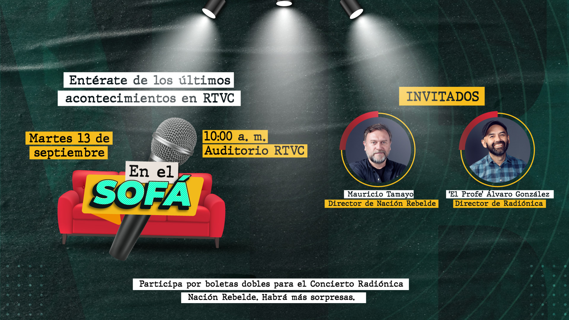 En esta oportunidad tendremos como invitados ‘En el Sofá’ a Álvaro González ‘‘El Profe’’, director de Radiónica y a Mauricio Tamayo, director de Nación Rebelde, quienes nos contarán tras bambalinas de qué manera se ha venido trabajando en este proyecto, cuáles serán los artistas invitados y cómo podrás hacer parte de este evento.