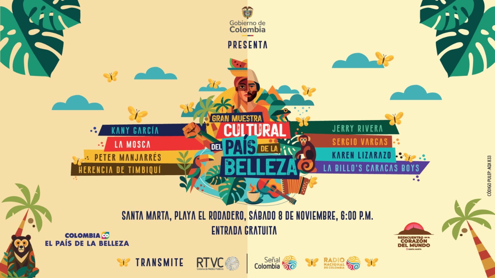 El sábado 8 de noviembre, en uno de los lugares más emblemáticos del Magdalena, ‘Playa de los cocos’, en Santa Marta, se dará una de las muestras culturales más grandes desde el Caribe colombiano y para el mundo entero, como parte de los eventos previos a la Cumbre CELAC–Unión Europea. Artistas de talla nacional e internacional pondrán a cantar y a bailar no solo a miles de asistentes, también a millones en el país que disfrutarán del evento a través de Señal Colombia y Radio Nacional de Colombia, como medios oficiales.