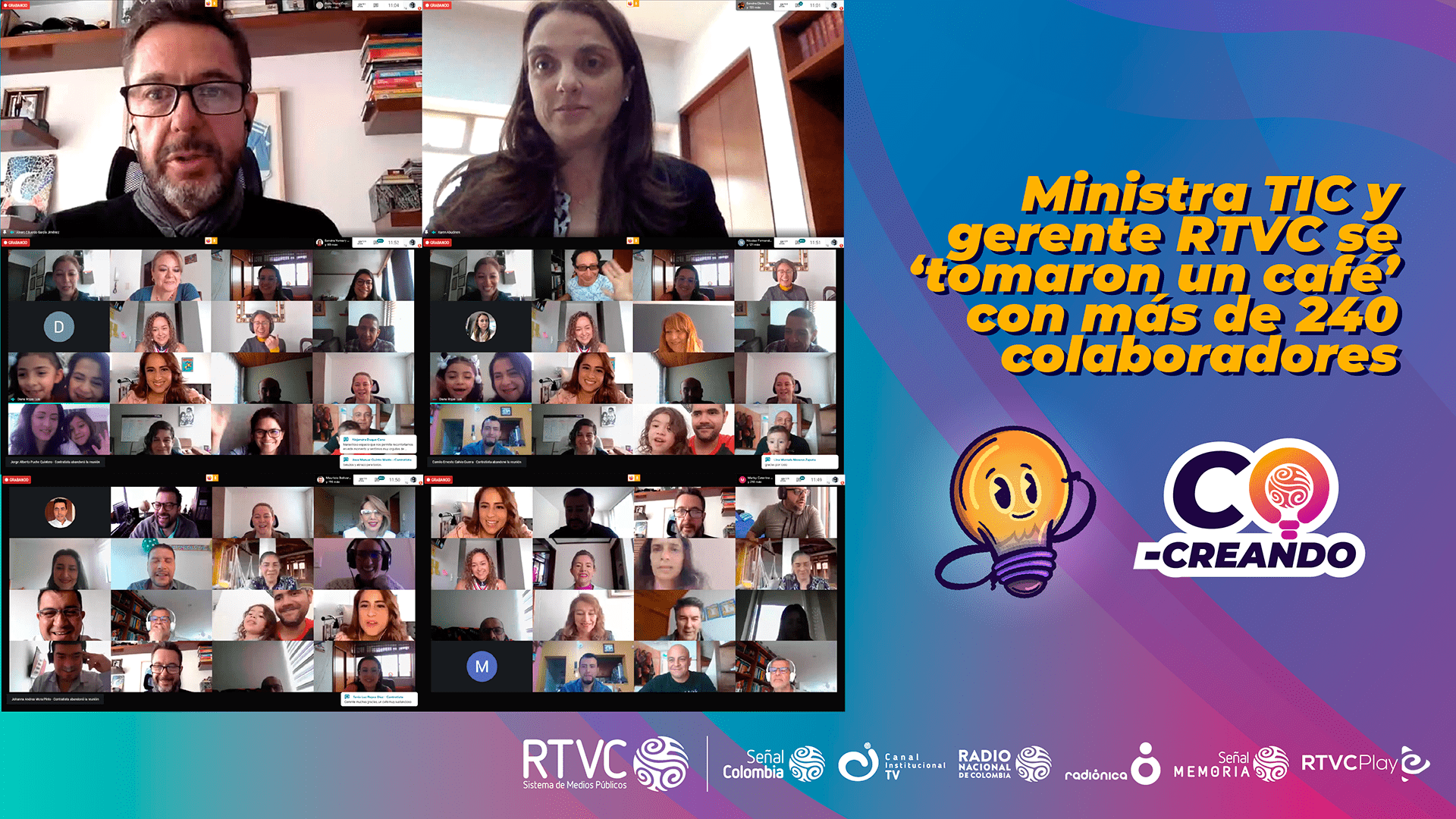 Con estas palabras que llenan de orgullo el trabajo de todos los colaboradores, transcurrió la primera charla virtual de la más reciente campaña ‘‘CO-CREANDO EN RTVC’’, en la que más de 240 personas que asistieron de forma virtual, tuvieron la oportunidad de conocer de primera mano la importancia de la innovación, la tecnología y la gestión del conocimiento a través de las vivencias y experiencias en las carreras profesionales de la doctora Abudinen y el gerente Álvaro García.