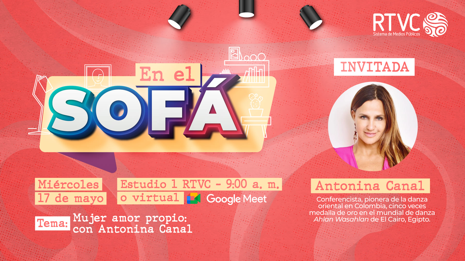 RTVC, a través de la Coordinación de Gestión de Comunicaciones, tiene el placer de invitar a toda la familia del Sistema de Medios Públicos a nuestro cuarto ‘En el Sofá’ de 2023, el cual se realizará de manera virtual a través de la aplicación Google Meet y presencial en el estudio 1 de RTVC, este miércoles 17 de mayo a las 9:00 a. m., en el marco de la celebración del mes de las madres.